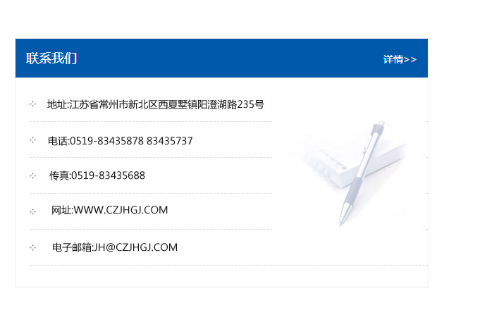 傳真:0519-83435688    郵編:213135    網址:WWW.czjhgj_com.zzlybyq.com    電子郵箱:JH@czjhgj_com.zzlybyq.com